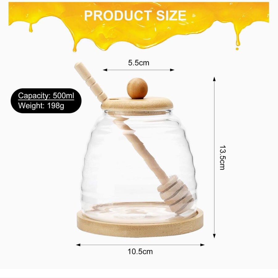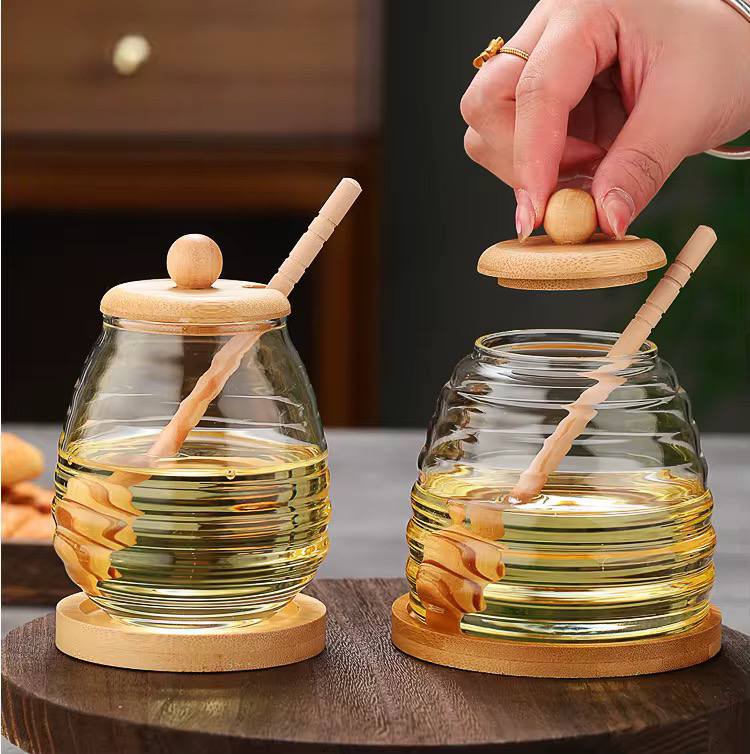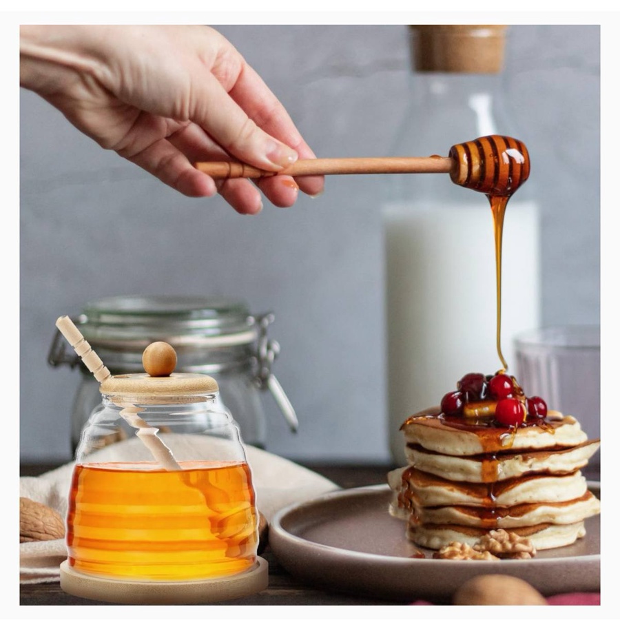 - رؤية واضحة: الشفافية العالية للزجاج تسمح لكِ بمتابعة كمية العسل ولونه بوضوح تام، مما يعطي مظهراً شهياً وجميلاً.