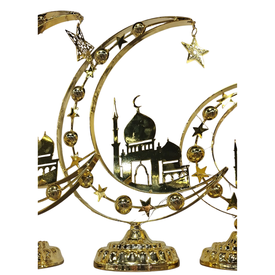 ضيفي لمسة روحانية وجمالية لبيتك في رمضان مع قطعة ديكور مميزة تجمع بين الهلال الذهبي و مجسم الجامع بتفاصيل فاخرة تخطف الأنظار. ✨ المواصفات: خامة معدنية مطلية باللون الذهبي اللامع. تصميم هلال كبير مزين بنجوم وكرات زخرفية رائعة. مجسم جامع داخل الهلال بتفاصيل دقيقة وجذابة. قاعدة ثابتة ومتينة تمنح شكلاً راقياً على الطاولات والرفوف. مناسب لتزيين: غرف المعيشة – السفرة – مداخل البيوت – ركن رمضان. 🎁 مثالي كهداية رمضان وعيد جميلة ومختلفة. 💡 يضفي جو رمضاني دافئ ومبهج على المكان.