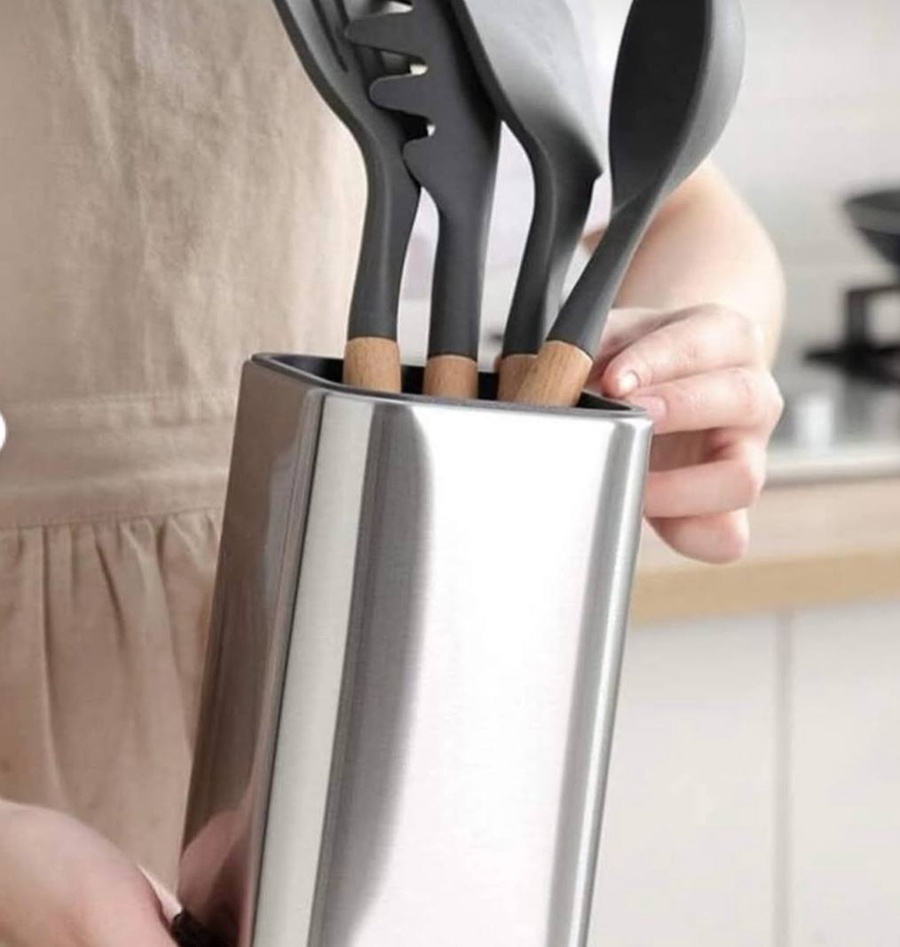 - خامة ثقيلة ومتينة: صُممت لتتحمل الأوزان والأعداد الكبيرة من المعالق والسكاكين دون أن تميل أو تهتز، بفضل قاعدتها المتزنة.