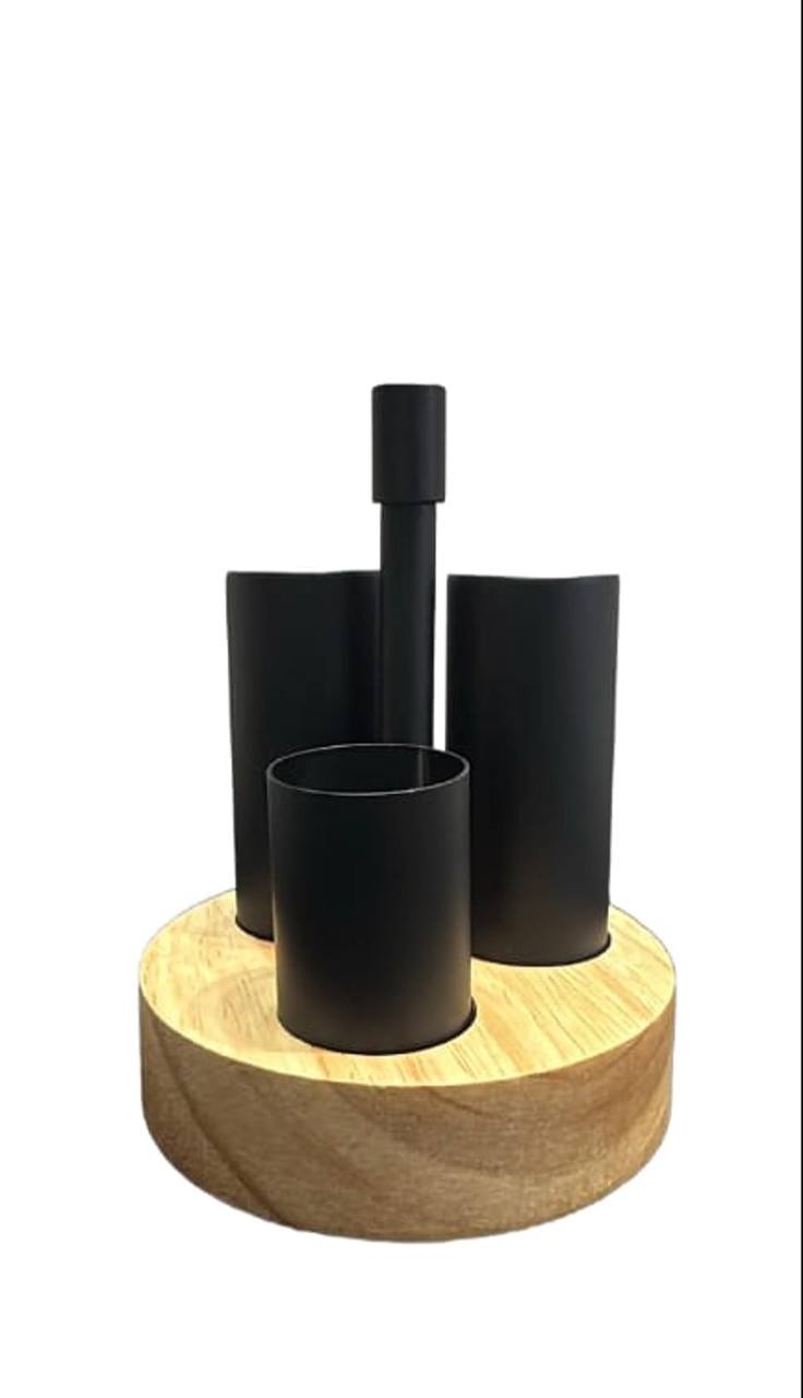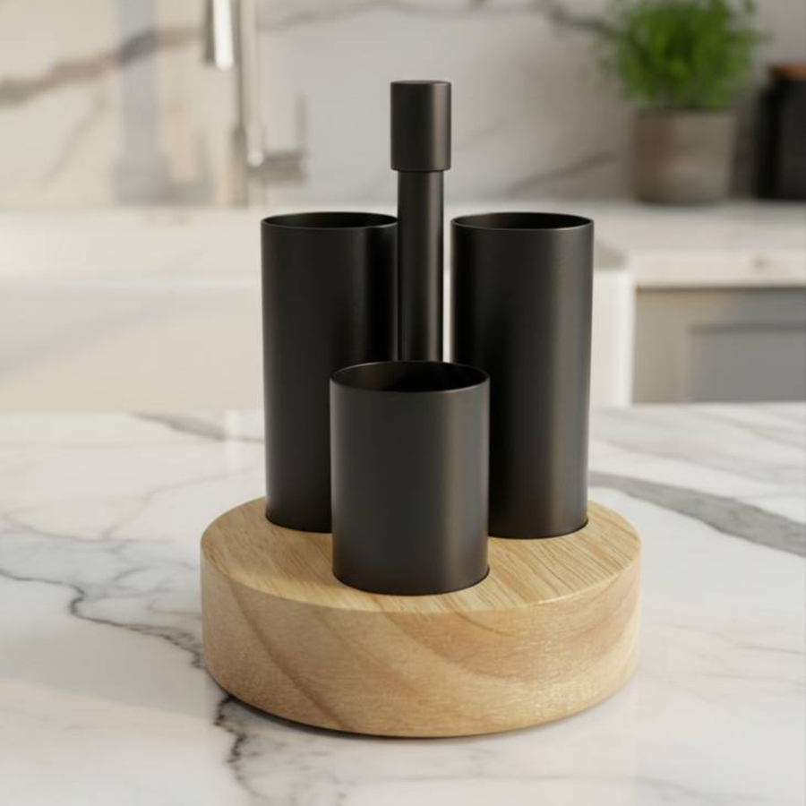 أضيفي لمسة من الرقي العصري لسفرتك مع طقم الملاحة الدائري باللون الأسود الملكي. تصميم يجمع بين قوة المعدن ودفء الخشب ليكون القطعة الأجمل في تقديماتك اليومية وفي العزومات.