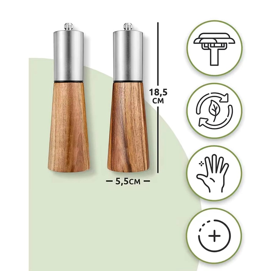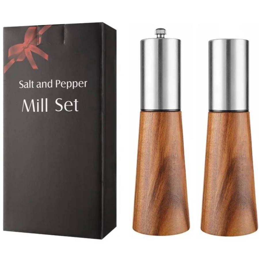 - طقم متكامل من قطعتين: يتكون من مطحنة فلفل وملاحة، ليكون مطبخك جاهزاً لجميع مهام التوابل بأسلوب متناسق وشيك.
