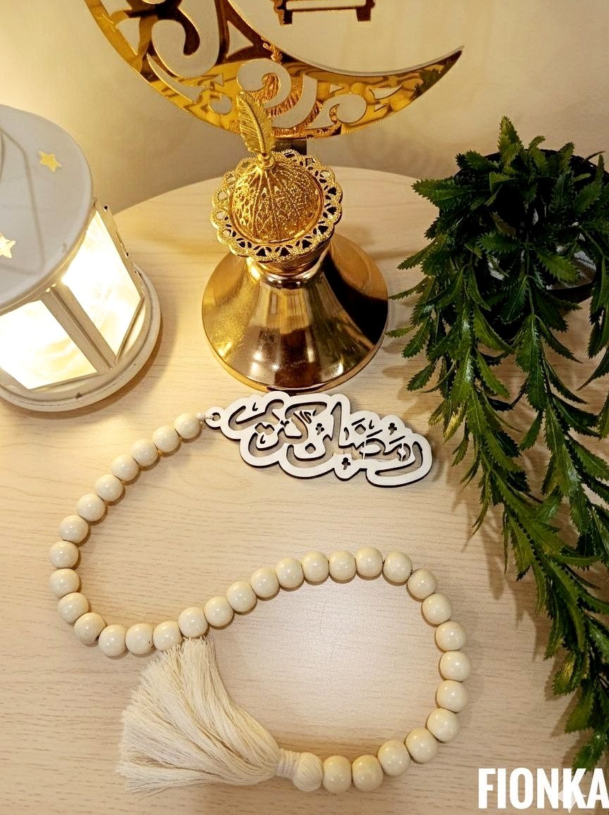 سبحة ديكورية من 33 خرزة خشبي مميز، مزودة بعبارة رمضان كريم وفرانشة هاند ميد 100%، بتصميم أنثوي ناعم ومظهر ترندي لا ينتهي، ومتغلفة في بوكس فاخر ومعاه كارت معايدة جاهز للإهداء 🤍
