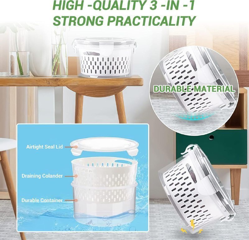 - توفير الوقت والمجهود: يمكنكِ غسل الخضروات وتصفيتها داخل نفس العلبة وتخزينها مباشرة دون الحاجة لنقلها لعلب أخرى.