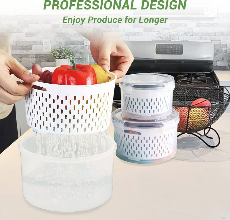- نظام التصفية الذكي: كل علبة مزودة بـ سلة (مصفاة) داخلية ترفع الطعام بعيداً عن الرطوبة والمياه الزائدة، مما يمنع تعفن الخضروات ويحافظ عليها جافة وطازجة.