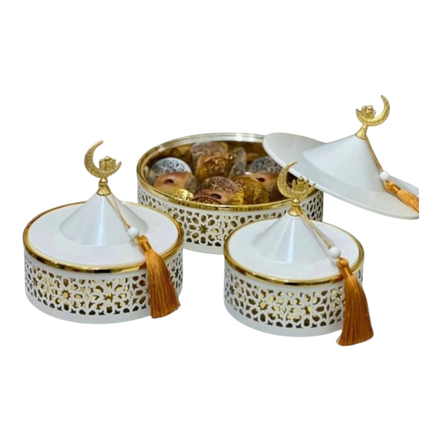- ثلاثة أحجام متكاملة: تأتي المجموعة بثلاثة مقاسات (كبير، متوسط، وصغير) لتناسب مختلف أنواع الضيافة من التمور المحشوة، المكسرات، أو الحلويات الشرقية.